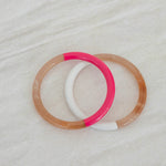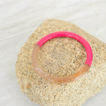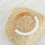 Ce jonc bicolore en résine joue la carte du contraste entre mat et brillant, effet corne et laque colorée. Sculptural mais léger, il apporte une touche graphique et solaire à toutes vos tenues.