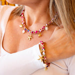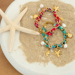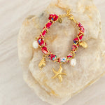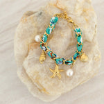 Bracelet composé d'un tissu aux motifs uniques, tressé avec une chaîne en acier inoxydable et embelli par des breloques marins (coquillages, étoile de mer, perles d'eau douce).