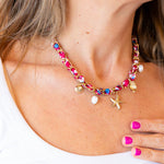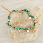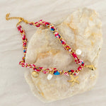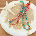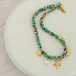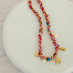 Collier composé d'un tissu aux motifs uniques, tressé avec une chaîne en acier inoxydable et embelli par des breloques marins (coquillages, étoile de mer, perles d'eau douce).