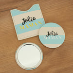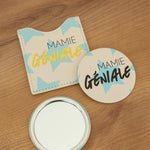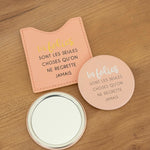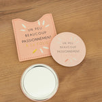 Glissé dans sa pochette assortie, ce miroir rond au joli motif et au message complice devient votre allié discret : pour vérifier un rouge à lèvres, ajuster une mèche ou s’offrir un petit sourire avant de foncer vers votre prochain rendez-vous.