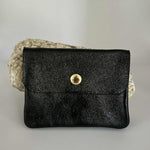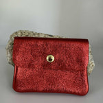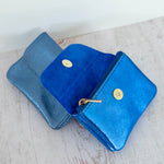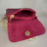 Matière : cuir de vachette, bouton en laiton aimanté, 3 compartiments, fermeture éclair.