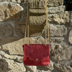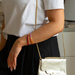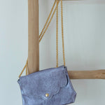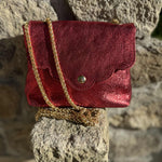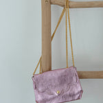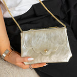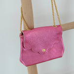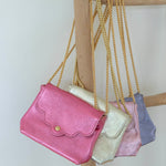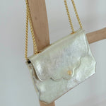Avec son cuir irisé, sa finition festonnée et sa bandoulière chaîne dorée, il brille par son style autant que par sa praticité.