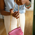 Son format mini n’en fait pas moins une pièce forte, à porter à l’épaule ou en bandoulière pour illuminer vos tenues d’un éclat subtil.