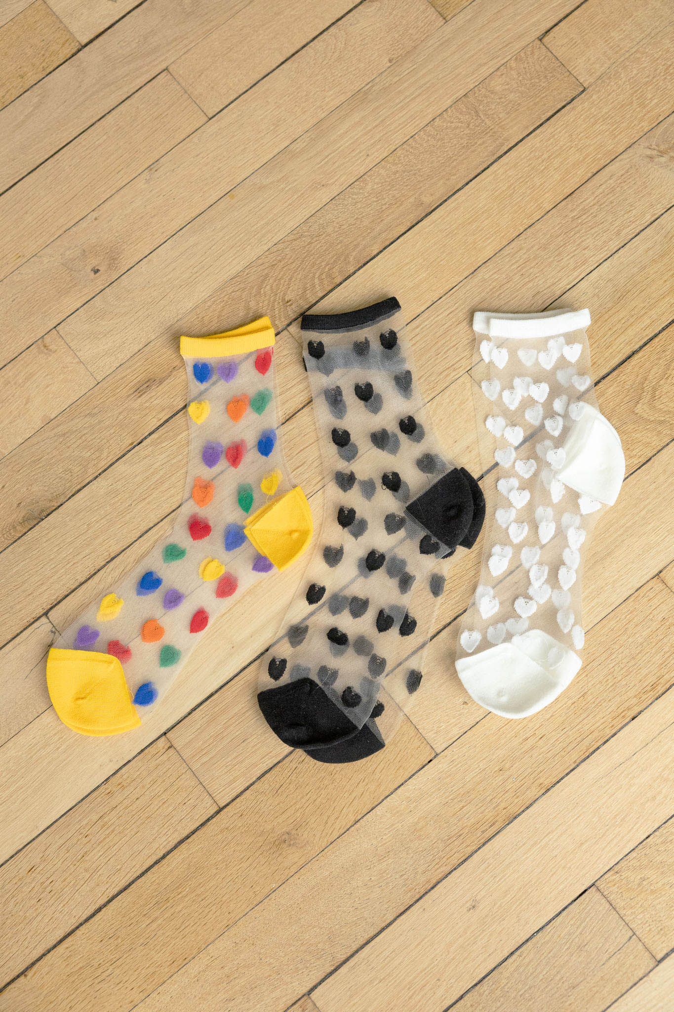 Ajoutez une touche tendre et pétillante à vos looks avec cette paire de socquettes fantaisie en tulle transparent, parsemée de petits cœurs.