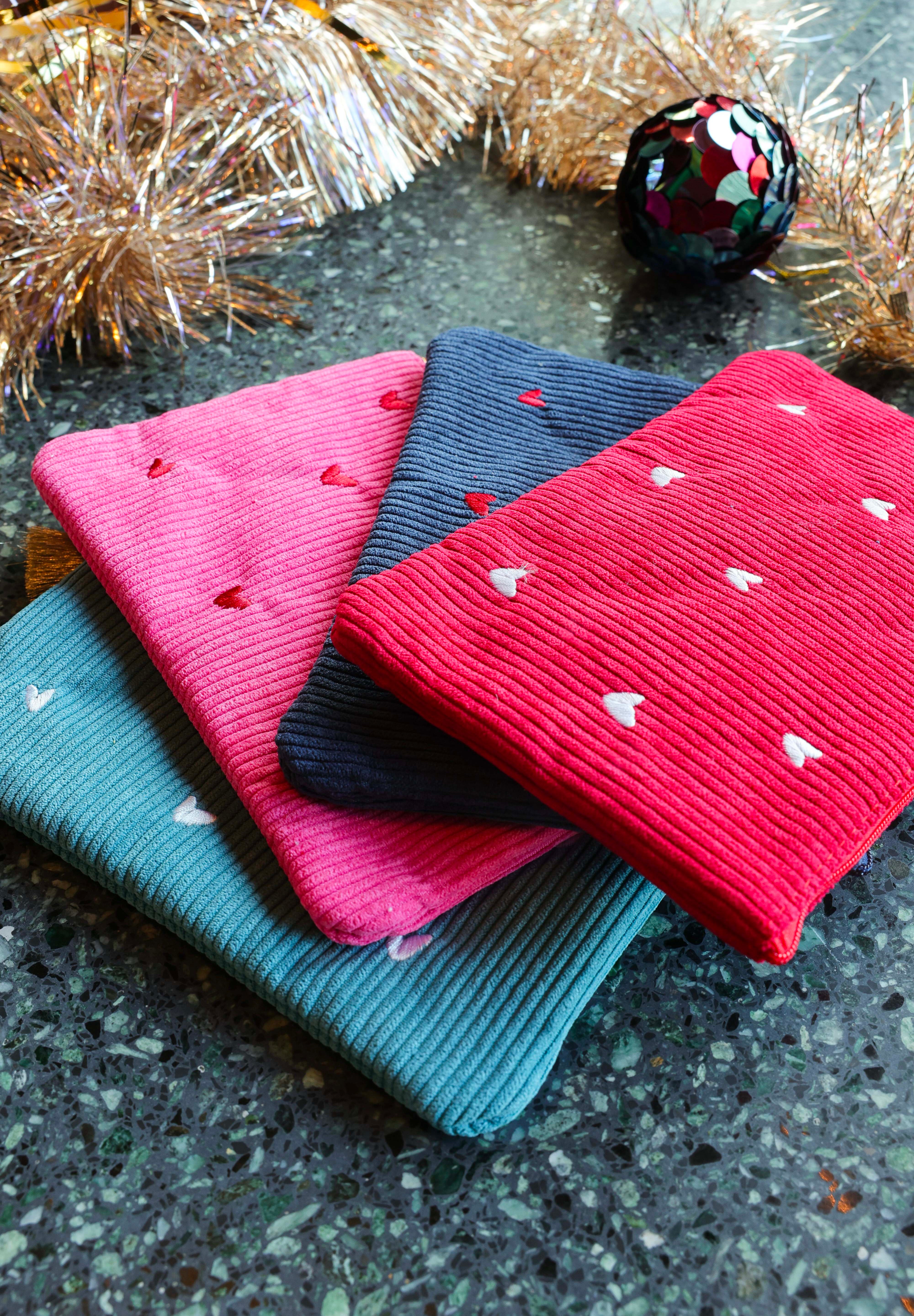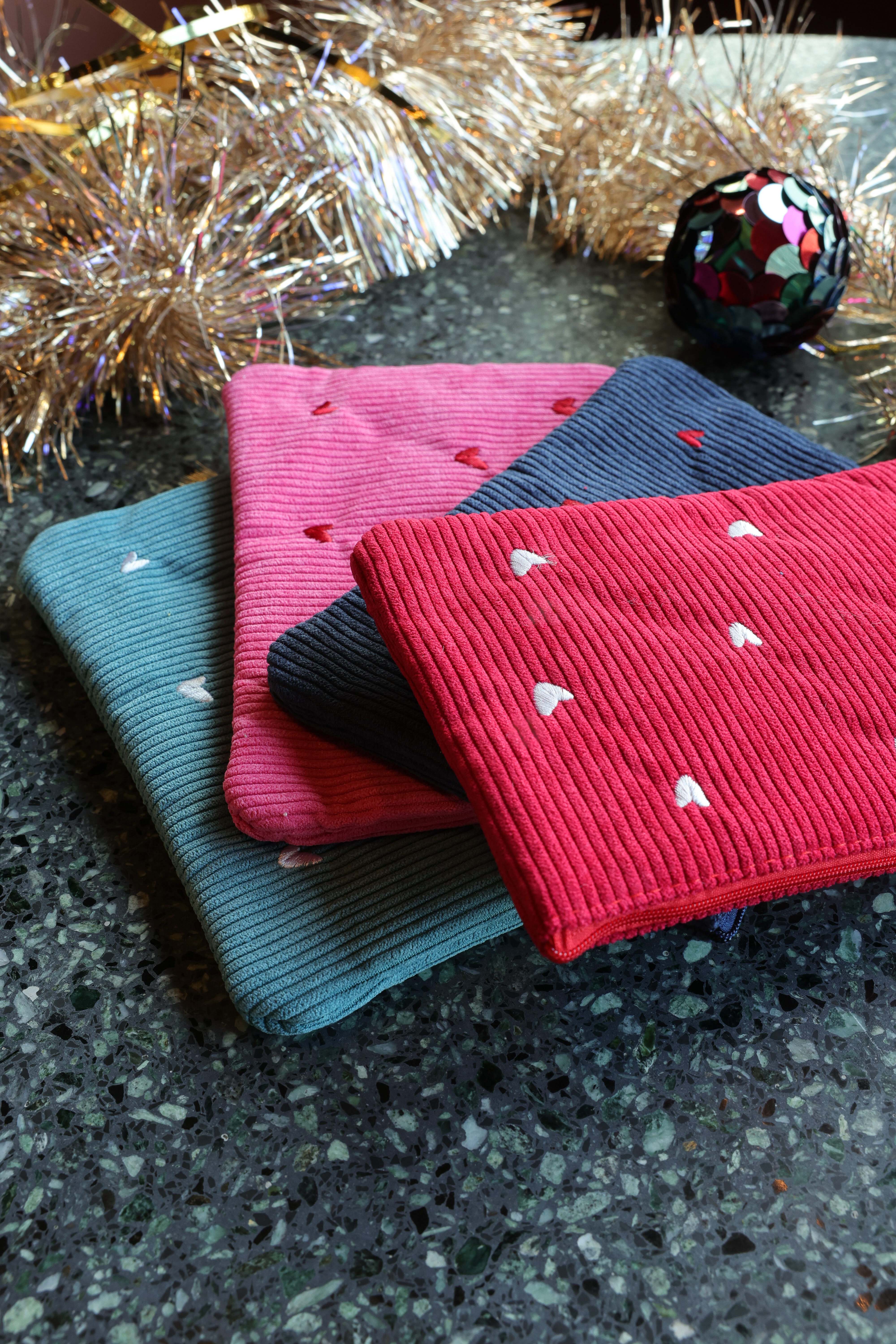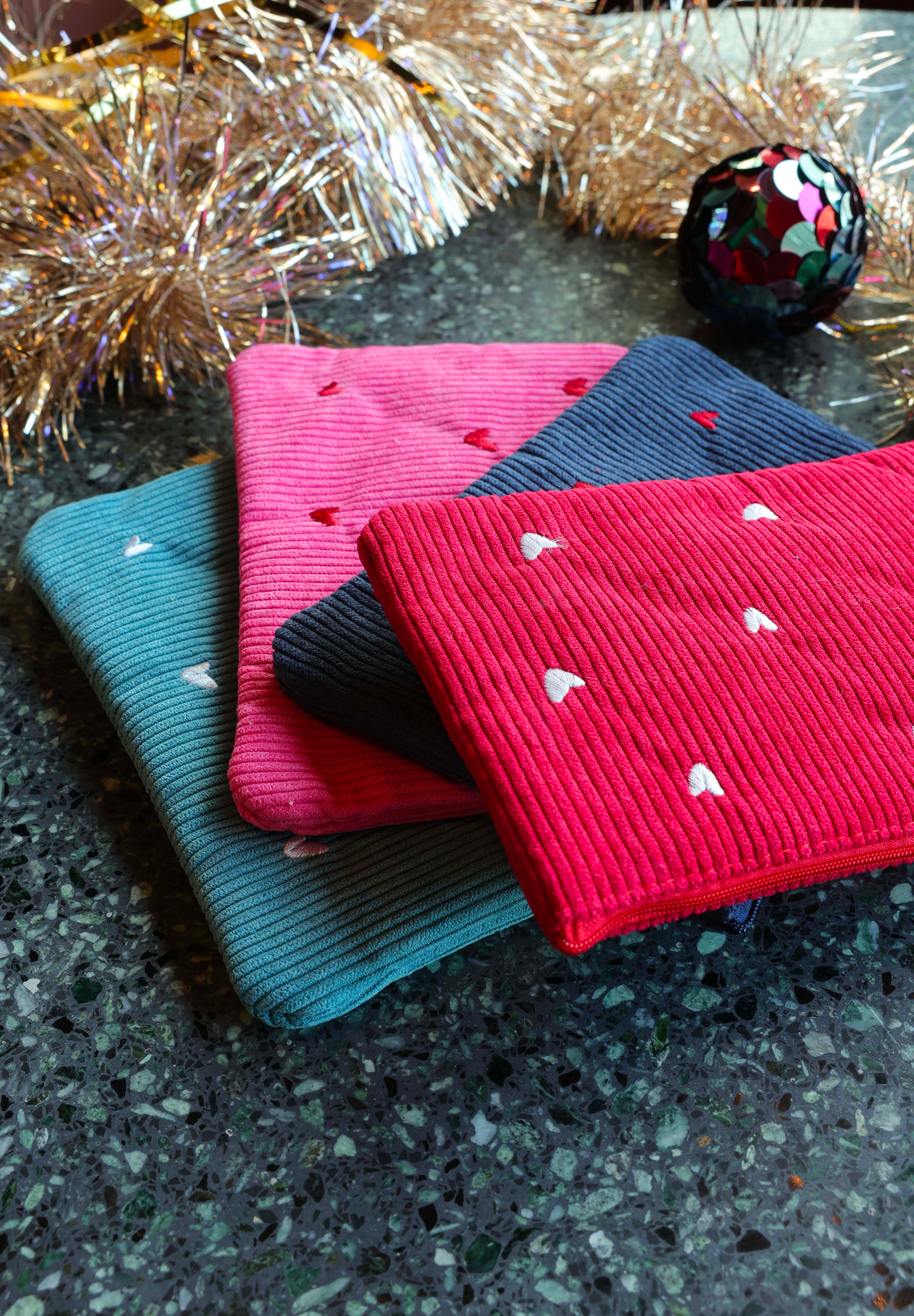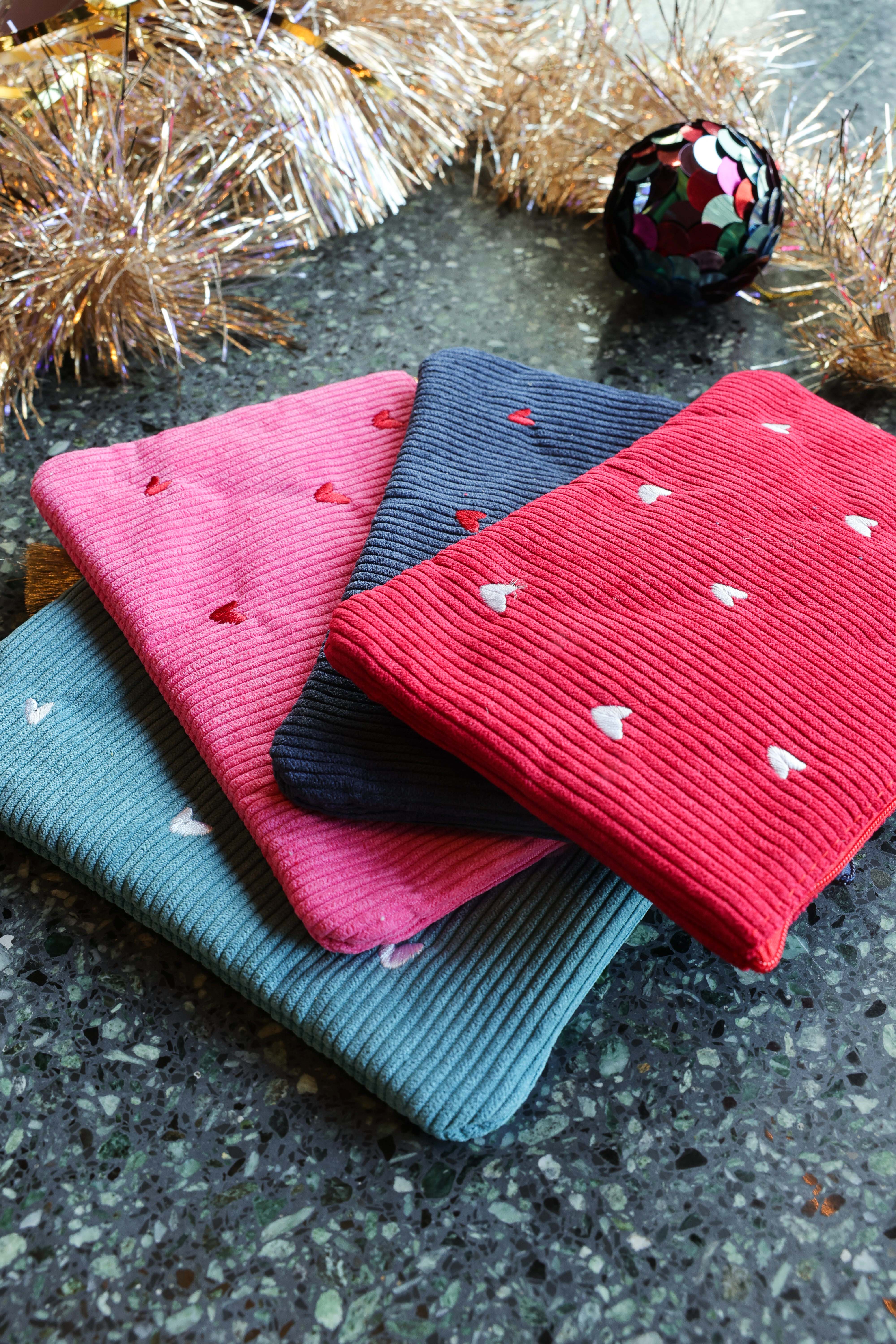 Cette pochette en velours côtelé signée Bohm Paris est douce, élégante et ultra-féminine, avec ses petits cœurs brodés.