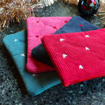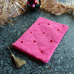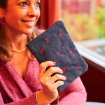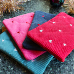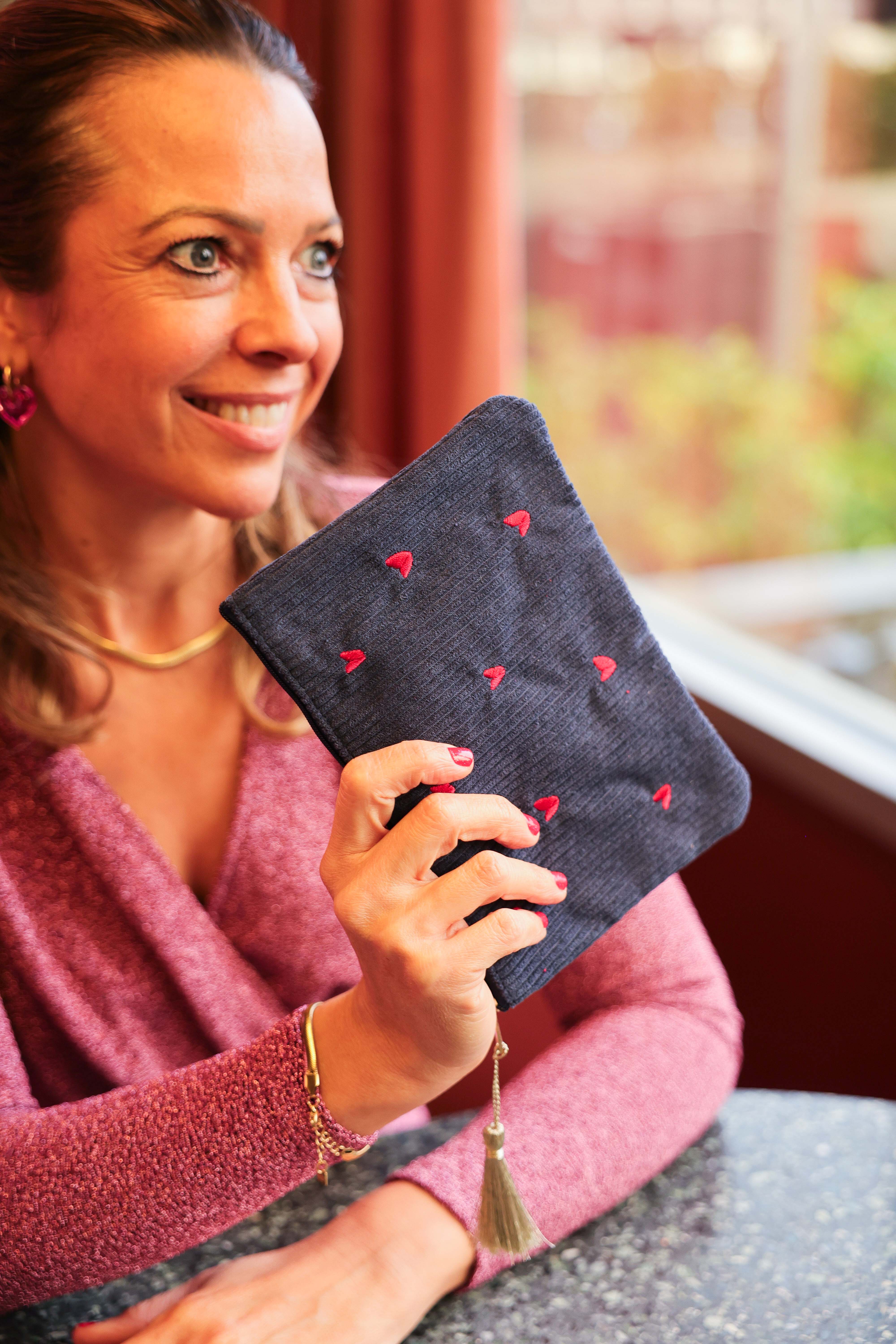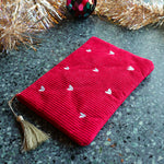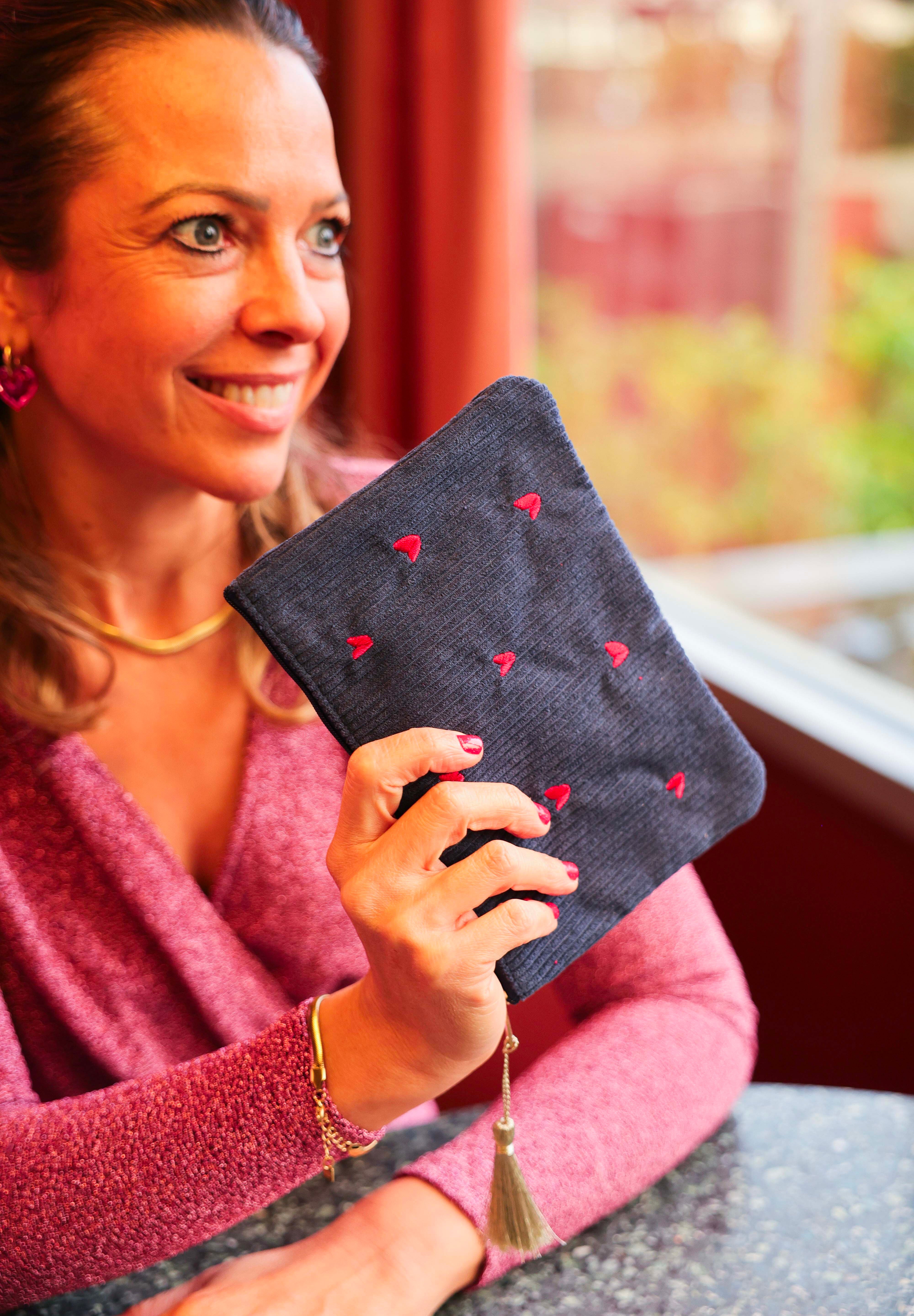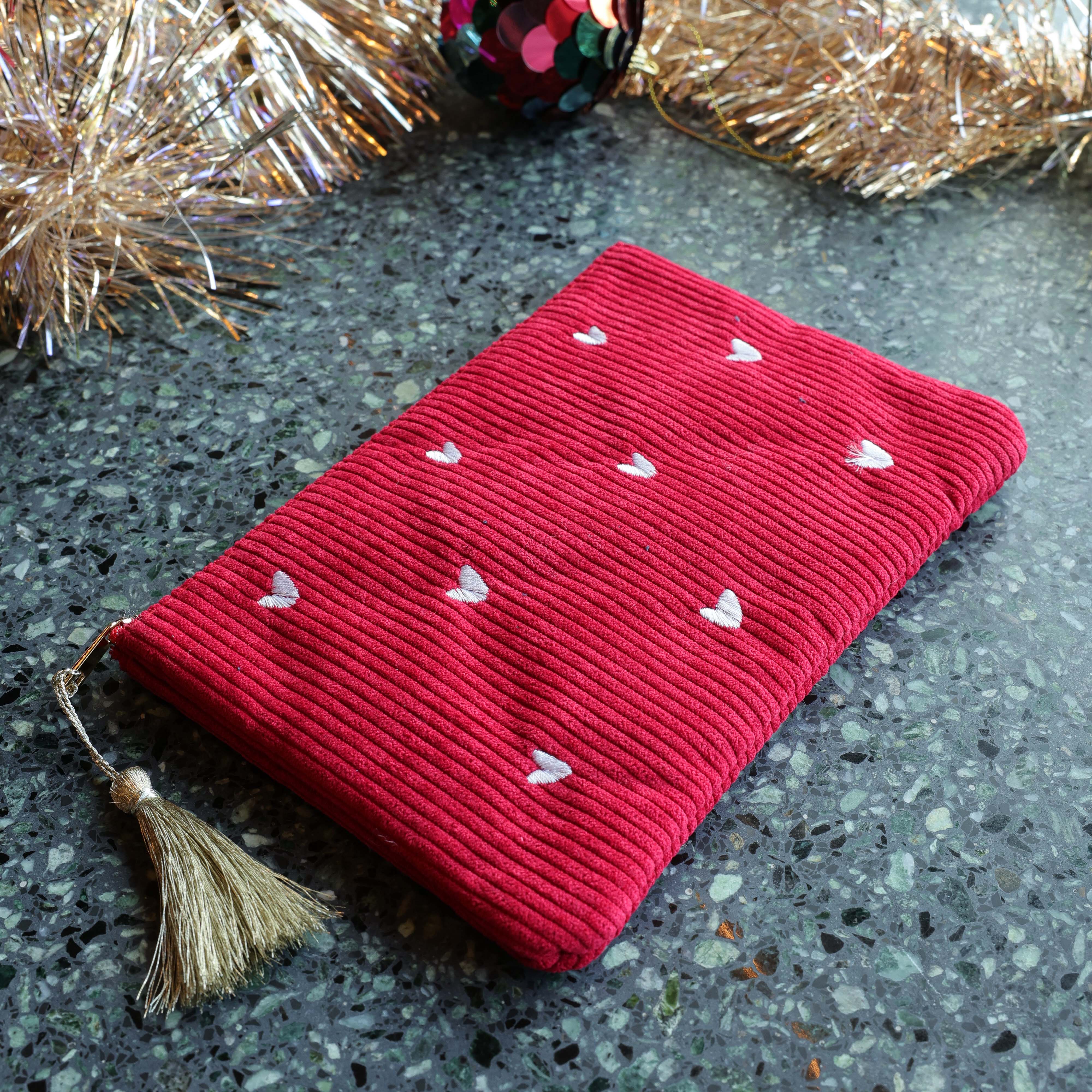 Cette pochette en velours côtelé signée Bohm Paris est douce, élégante et ultra-féminine, avec ses petits cœurs brodés.