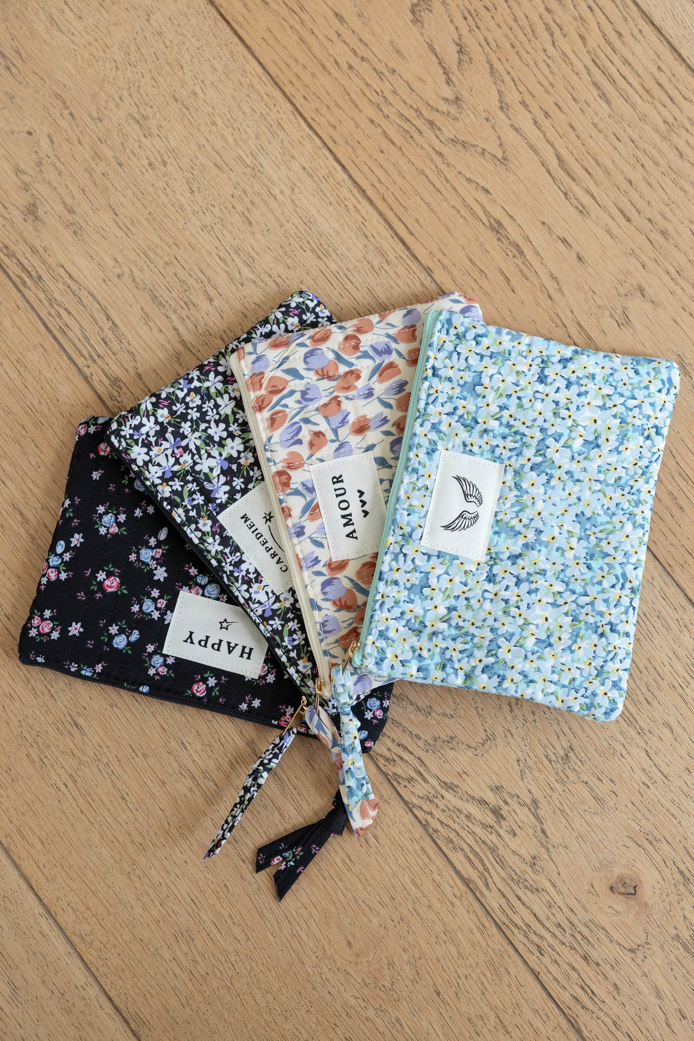 Trousses côtelées avec de jolis motifs imprimés et embellies par un mot message.