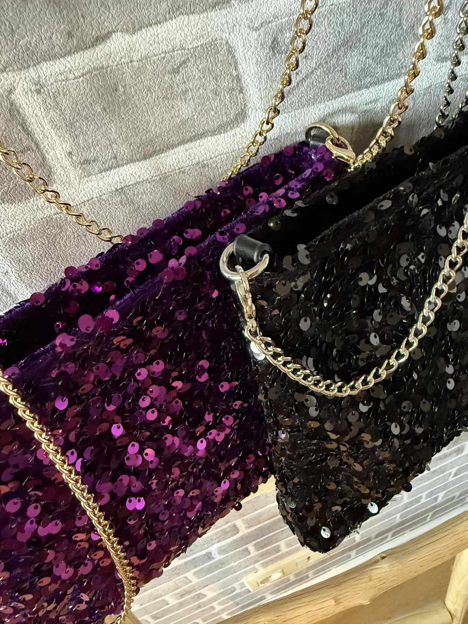 Son format généreux permet d’emporter l’essentiel sans compromis, tandis que sa finition à sequins capte la lumière à chaque mouvement.