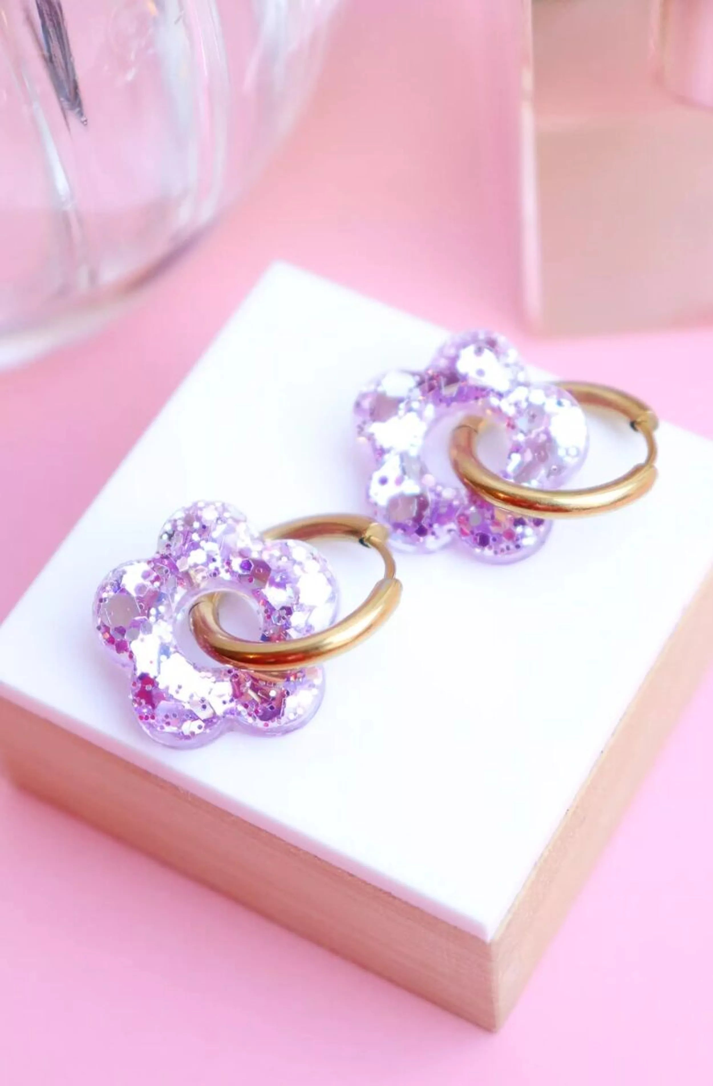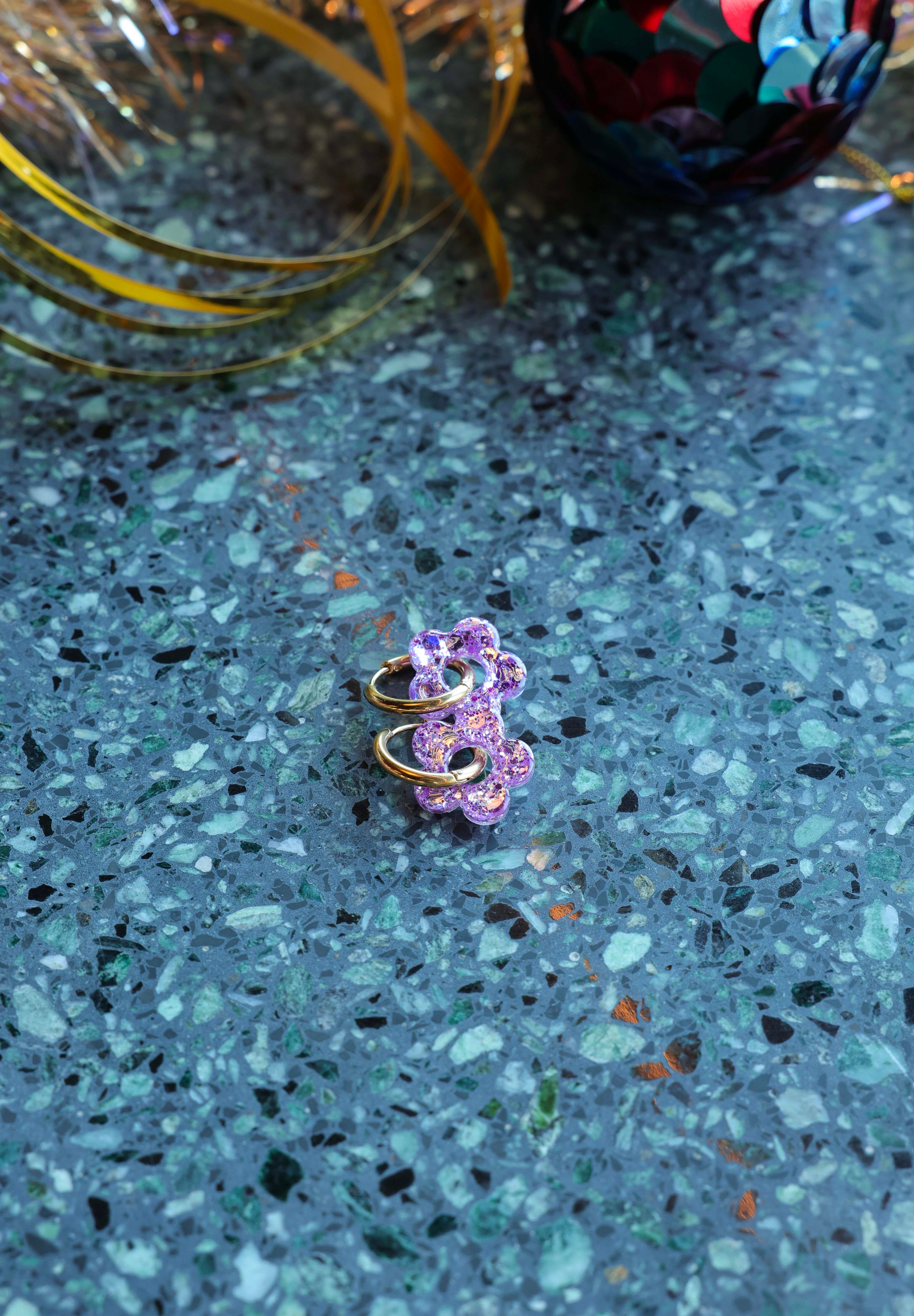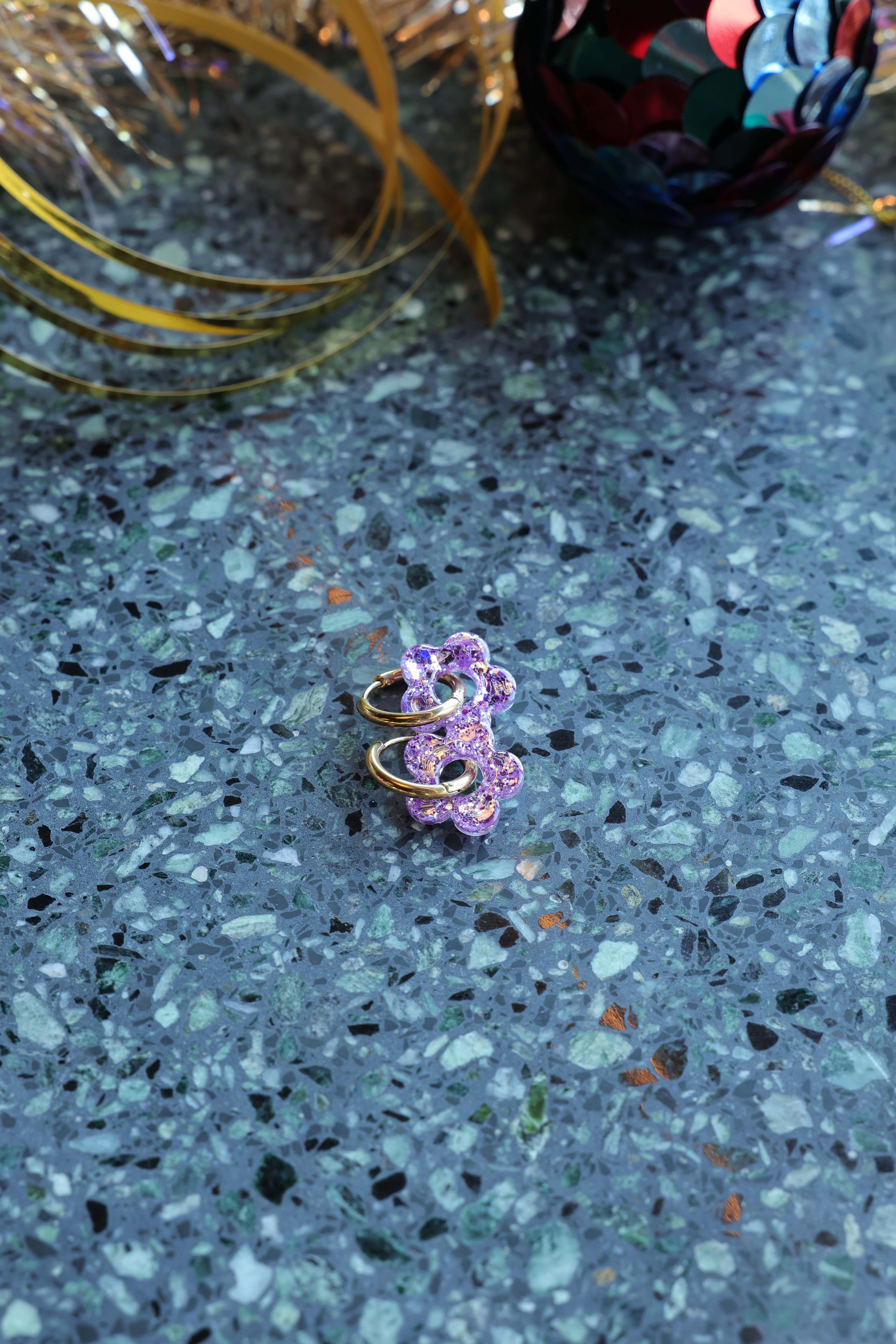 Avec leur petite fleur en résine et leur anneau doré, ces boucles mêlent fantaisie, douceur et éclat… tout ce qu’on aime chez Éclats de Jade 💖