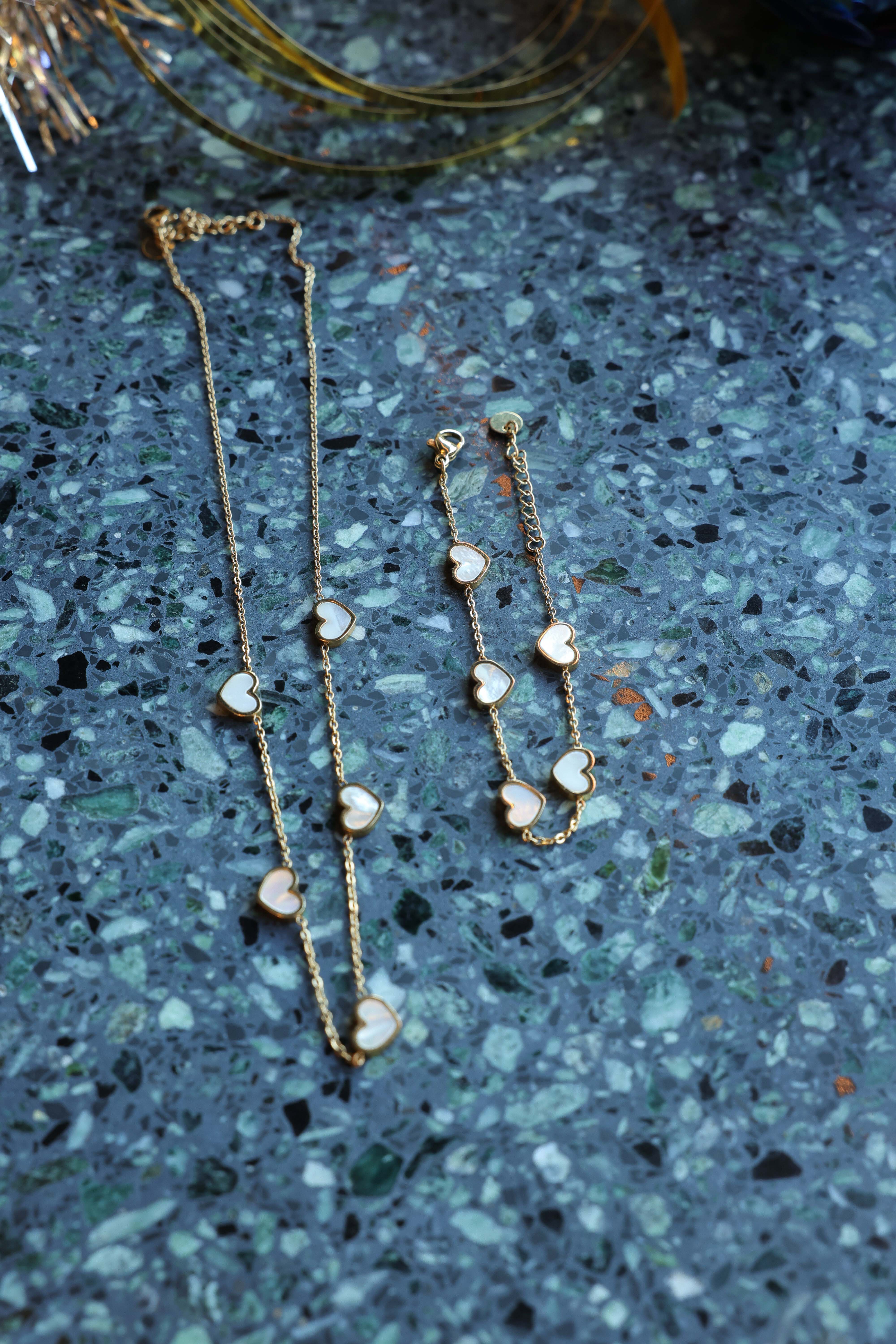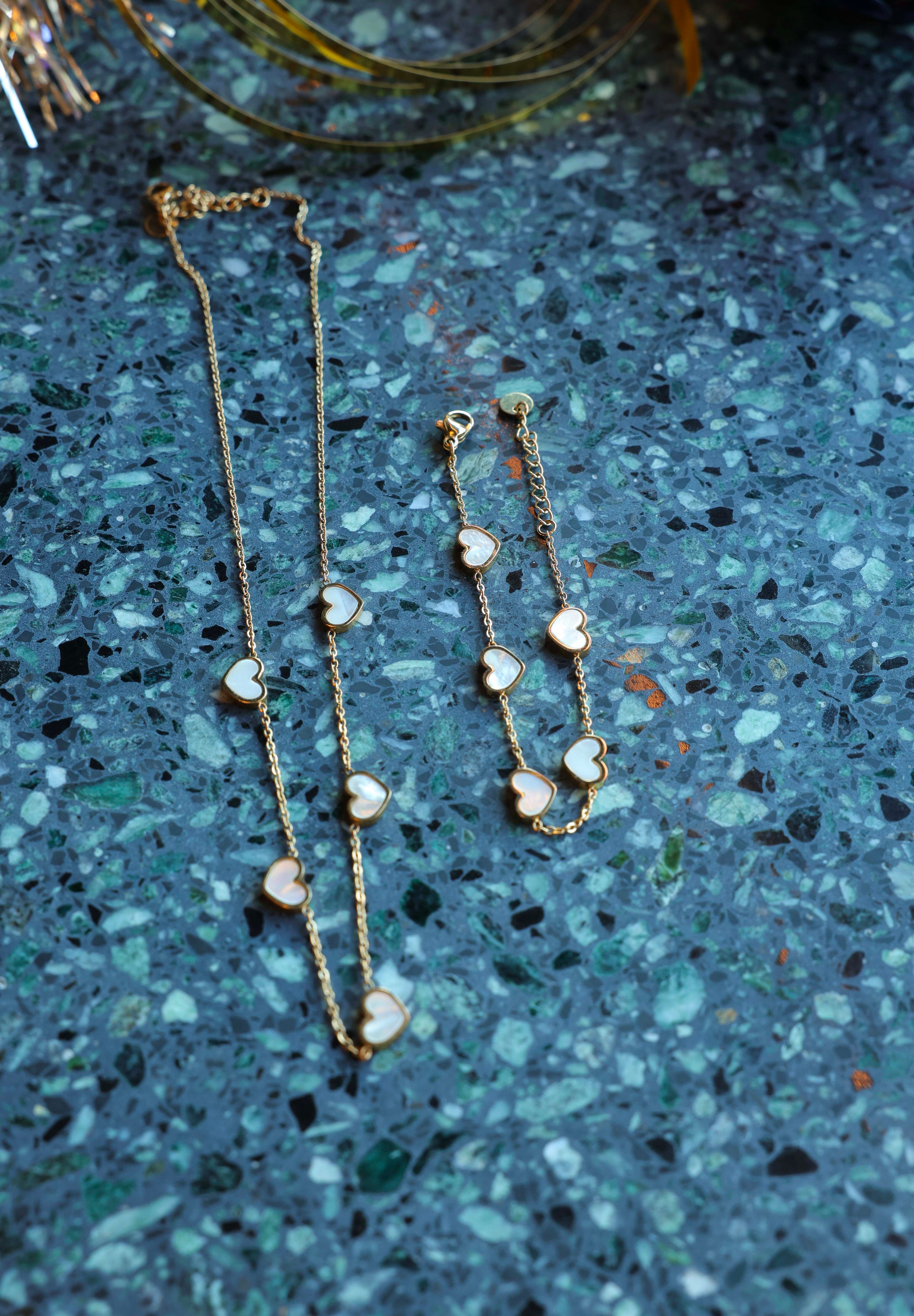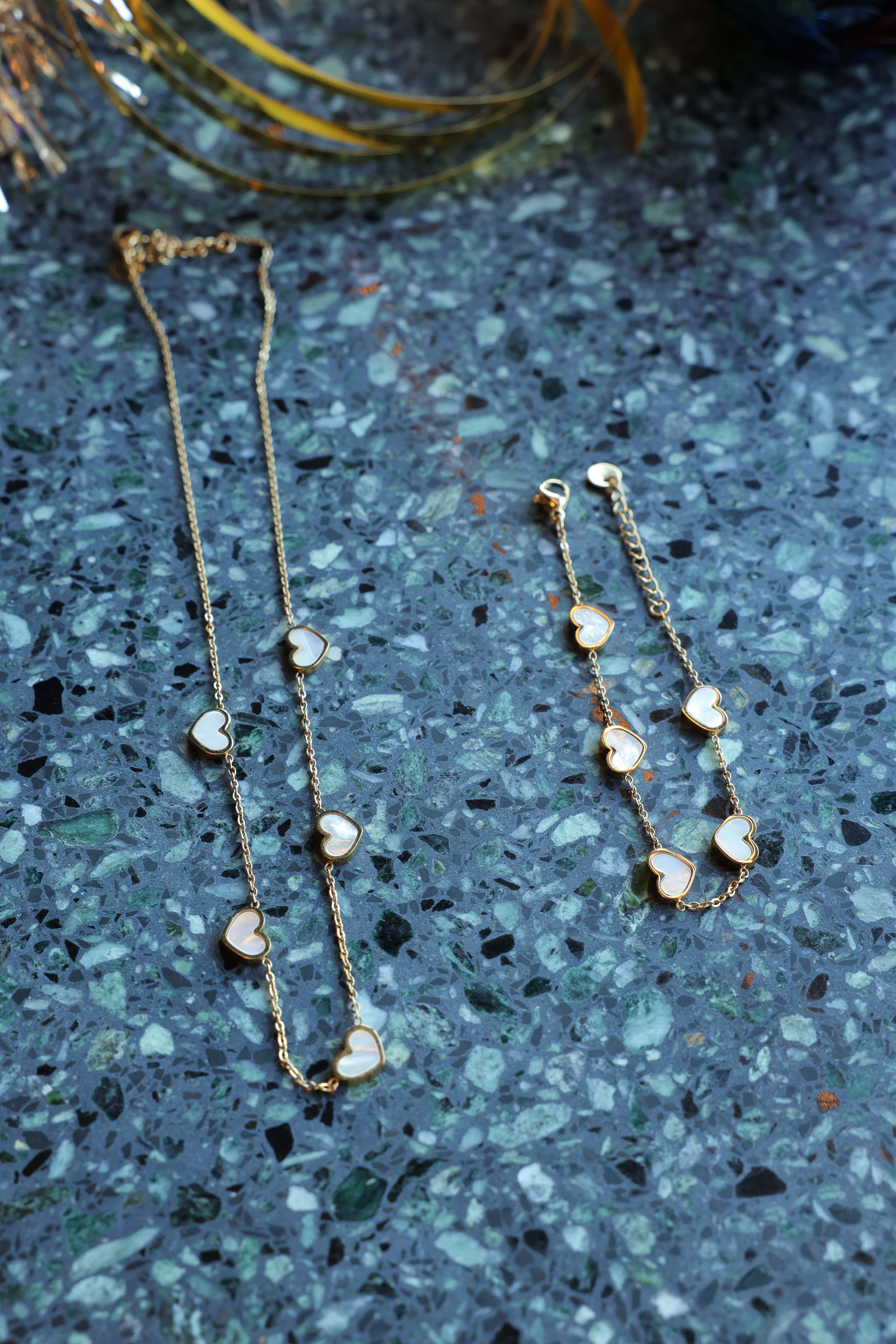 Un collier raffiné composé de cinq cœurs nacrés alignés avec délicatesse, comme autant de symboles de douceur, d’amour et de féminité.