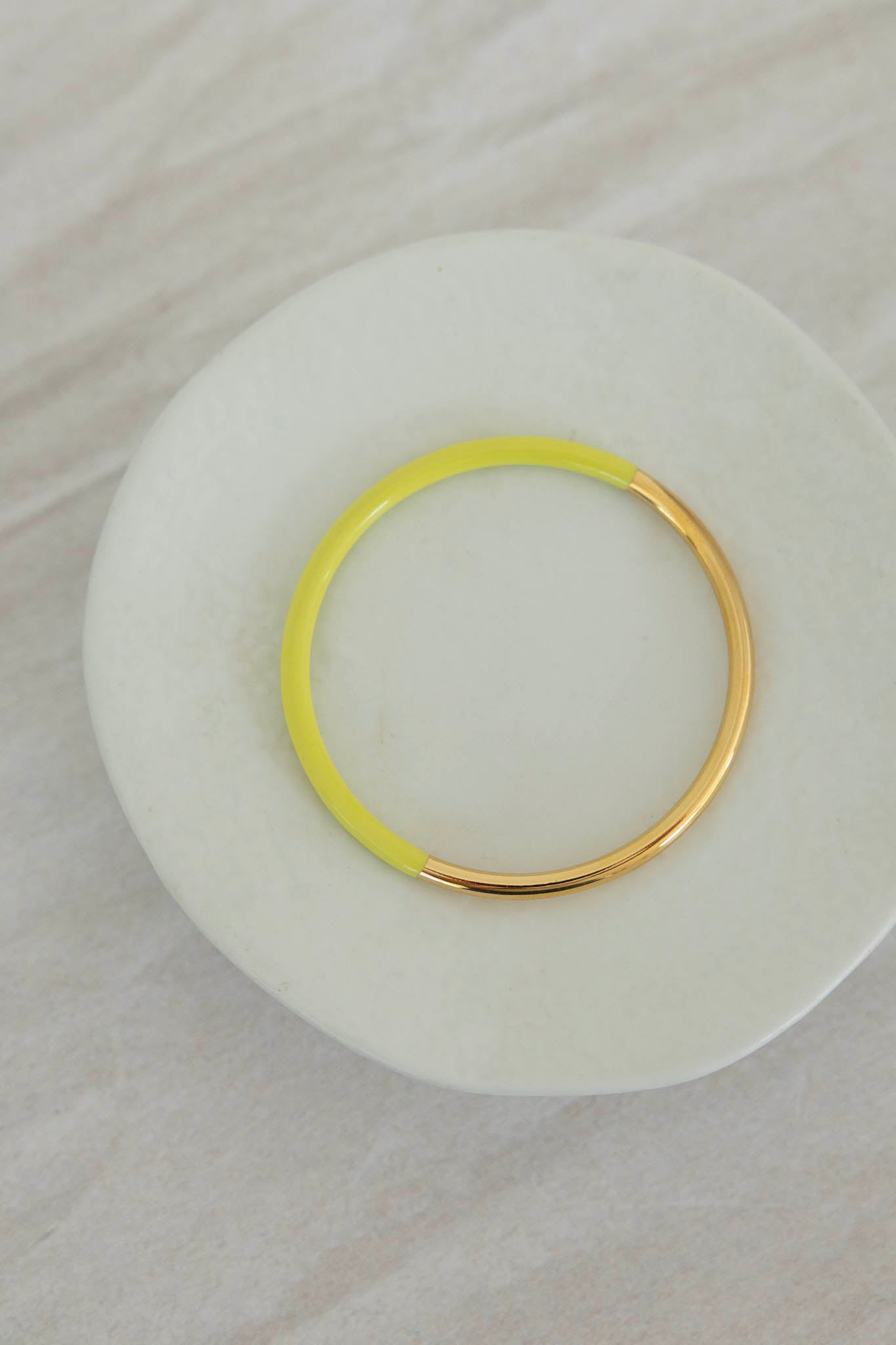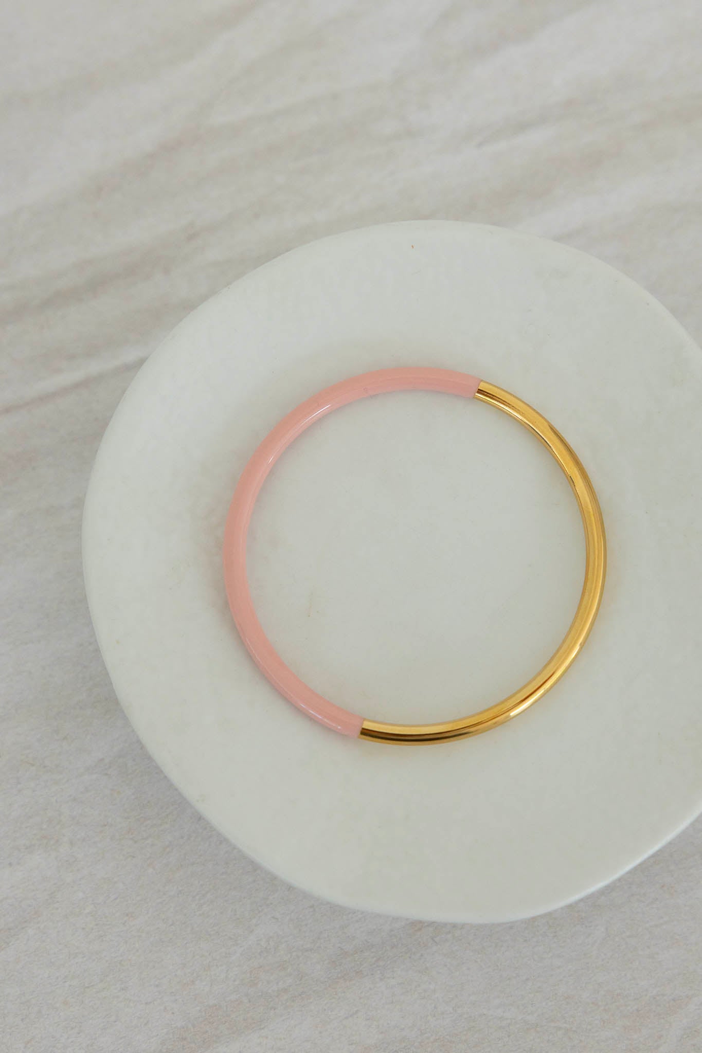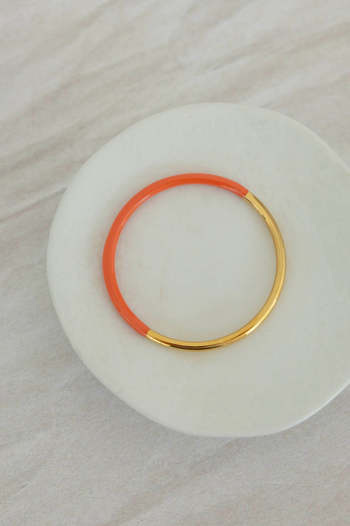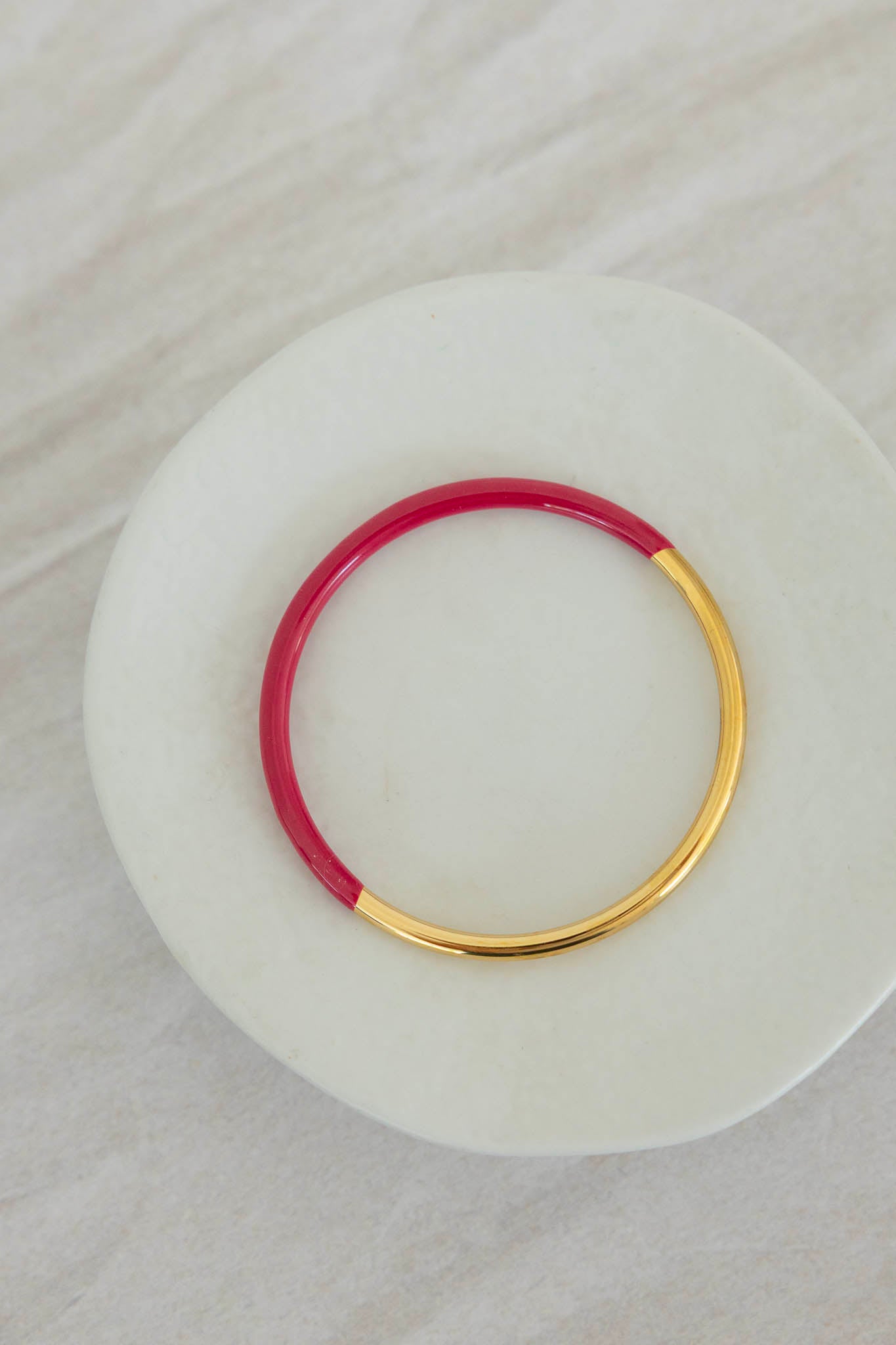 Minimaliste et affirmé, ce jonc en acier inoxydable joue sur les contrastes avec sa finition émaillée colorée et ses touches dorées lumineuses.