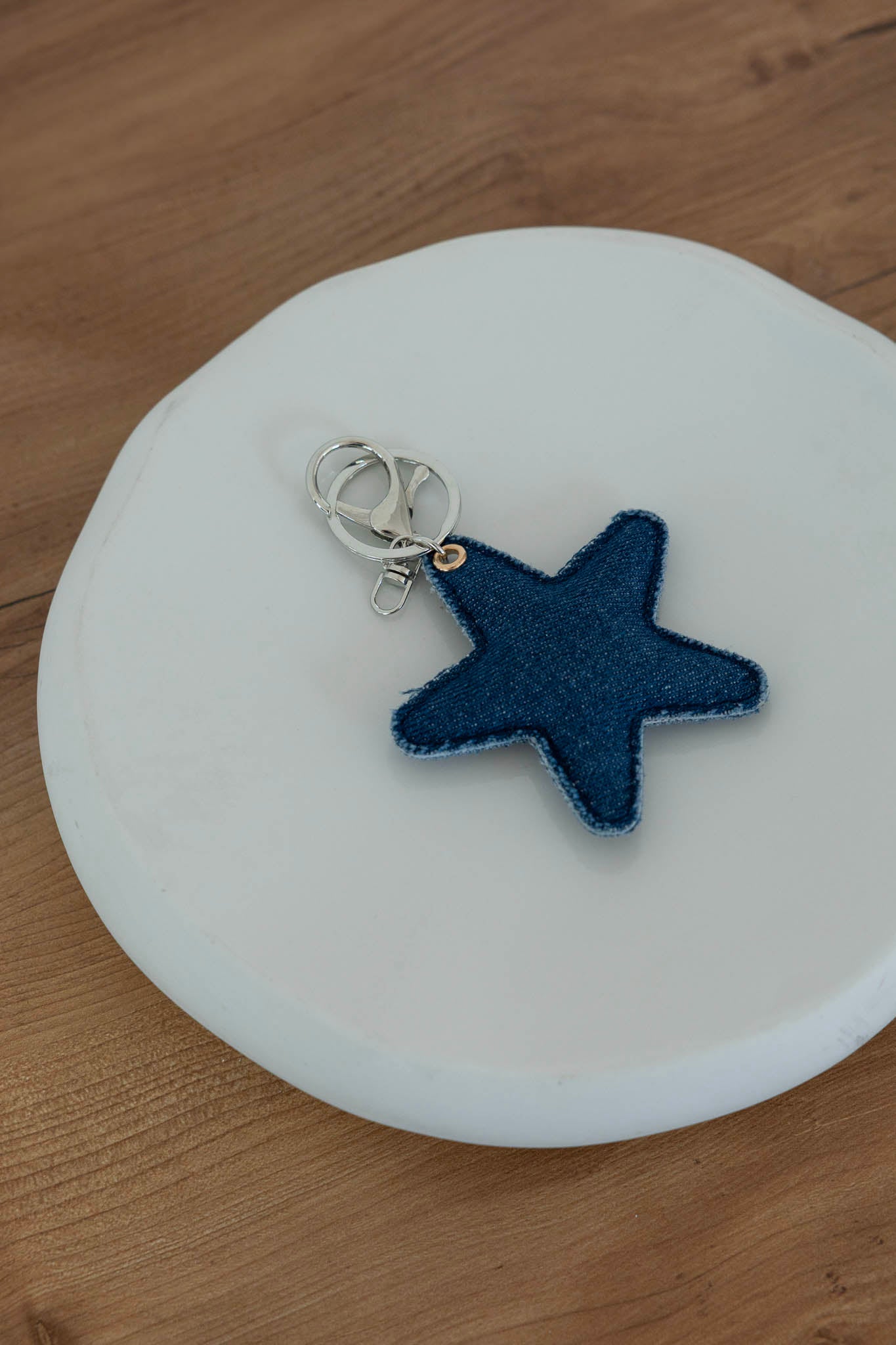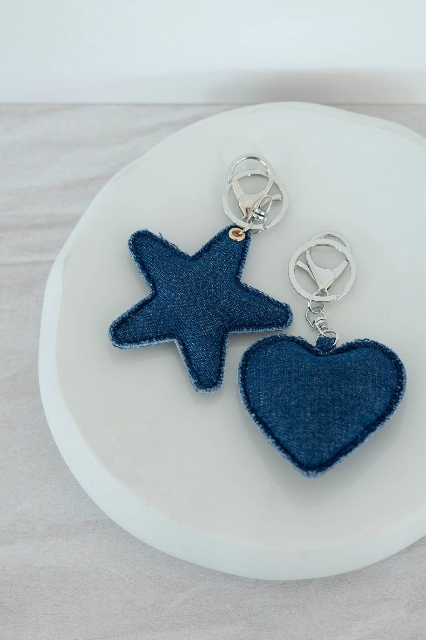 Porte-clé composé d'un cœur ou d'une étoile en tissu jean confectionné délicatement à la main.