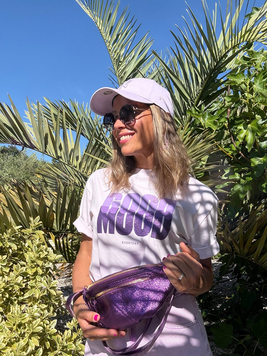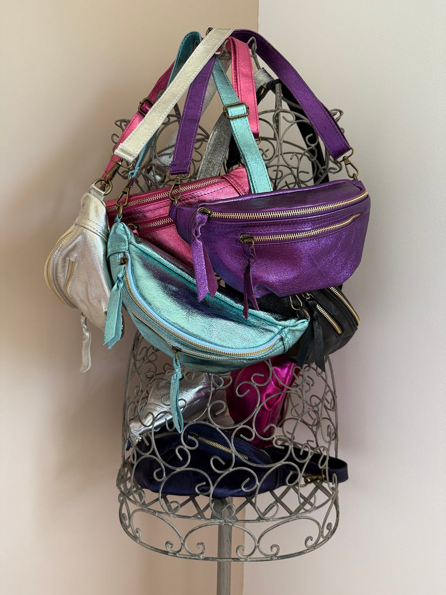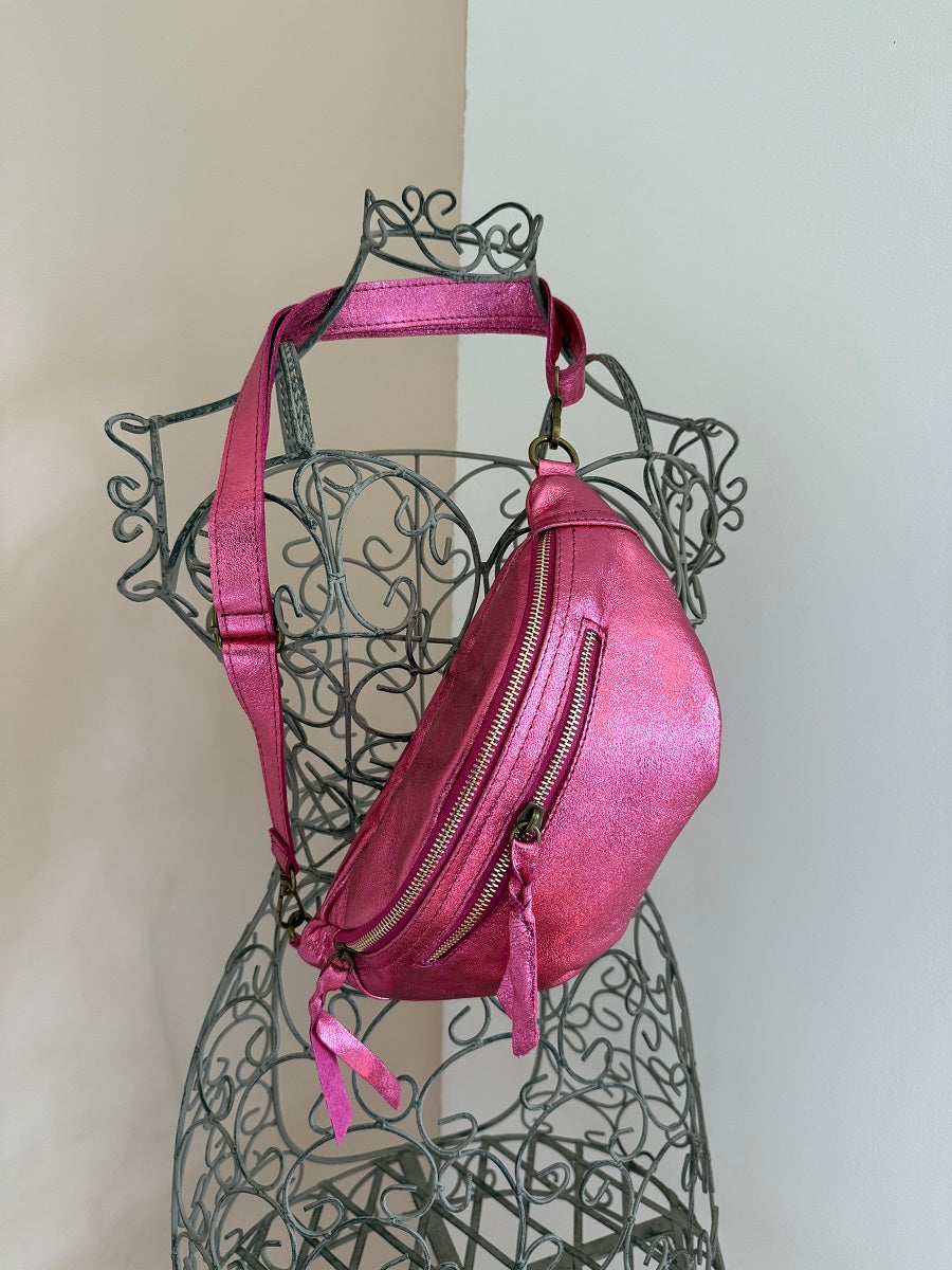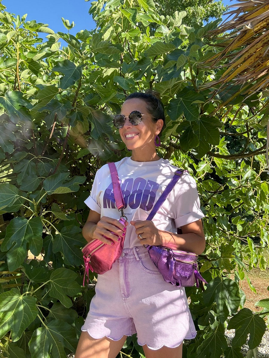 Avec sa forme arrondie ultra tendance, son cuir effet irisé et ses finitions lumineuses, ce modèle demi-lune se porte à la taille ou en crossbody pour garder les mains libres avec élégance.