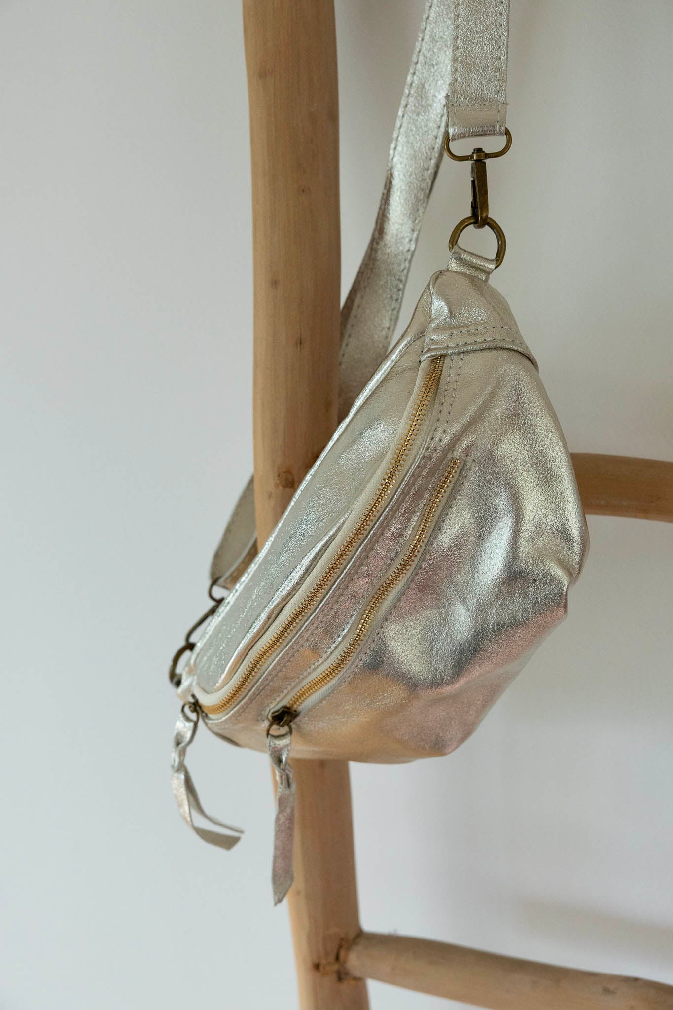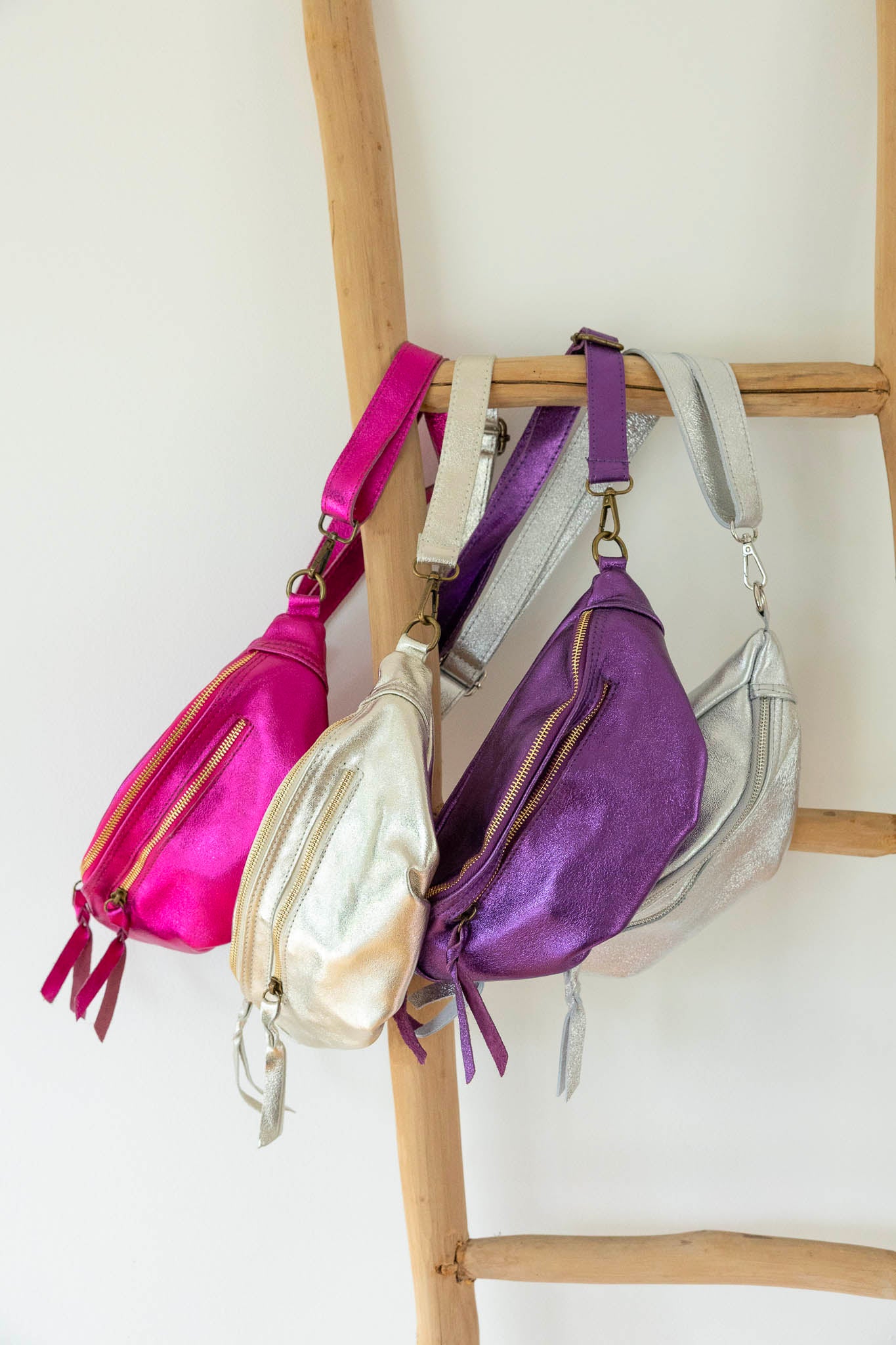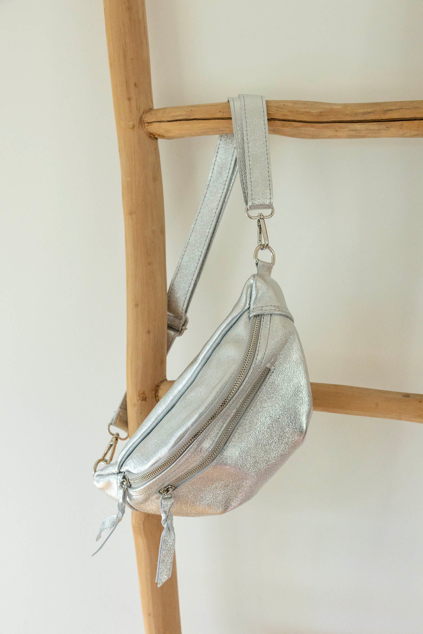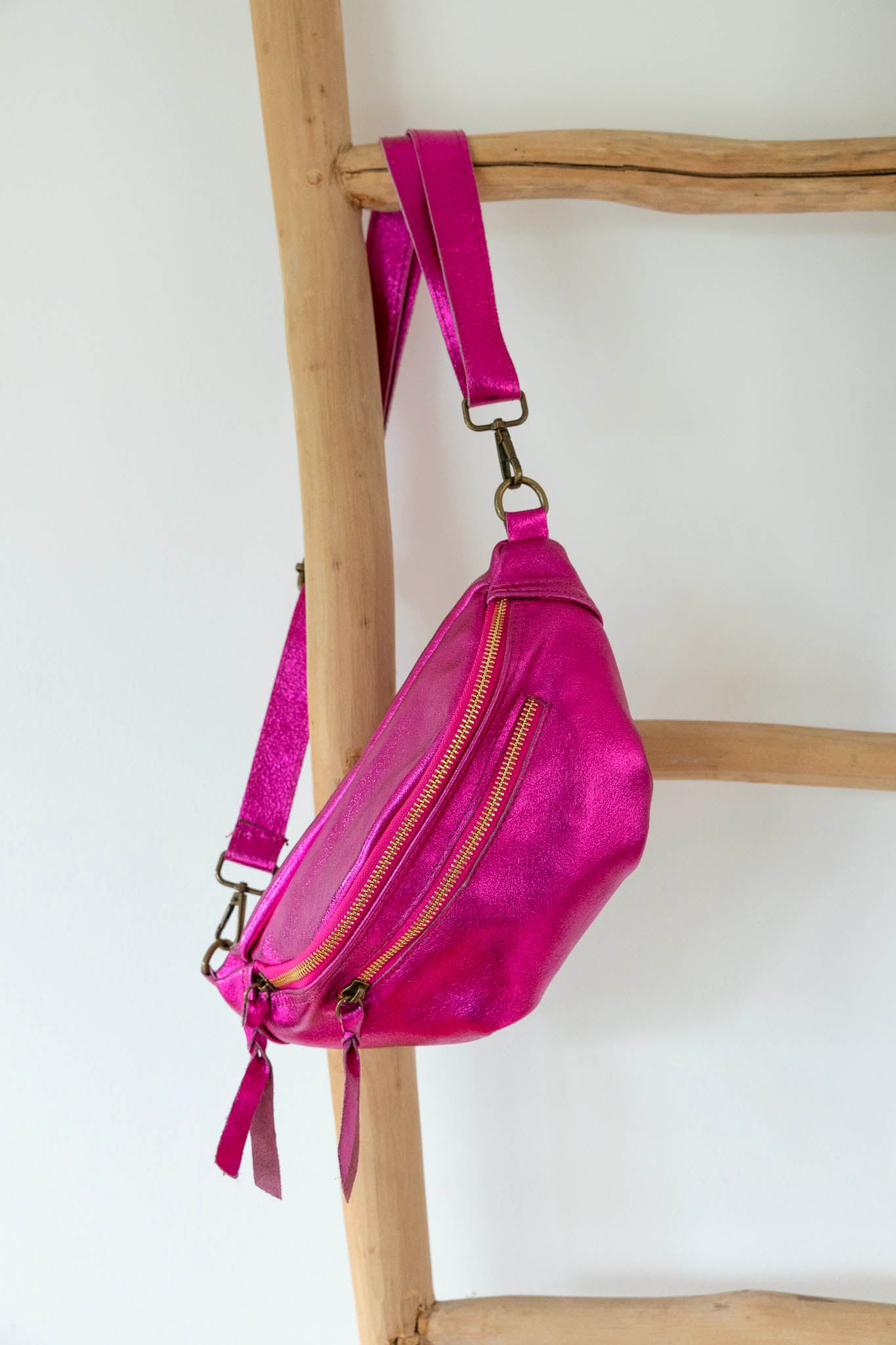 Avec sa forme arrondie ultra tendance, son cuir effet irisé et ses finitions lumineuses, ce modèle demi-lune se porte à la taille ou en crossbody pour garder les mains libres avec élégance.