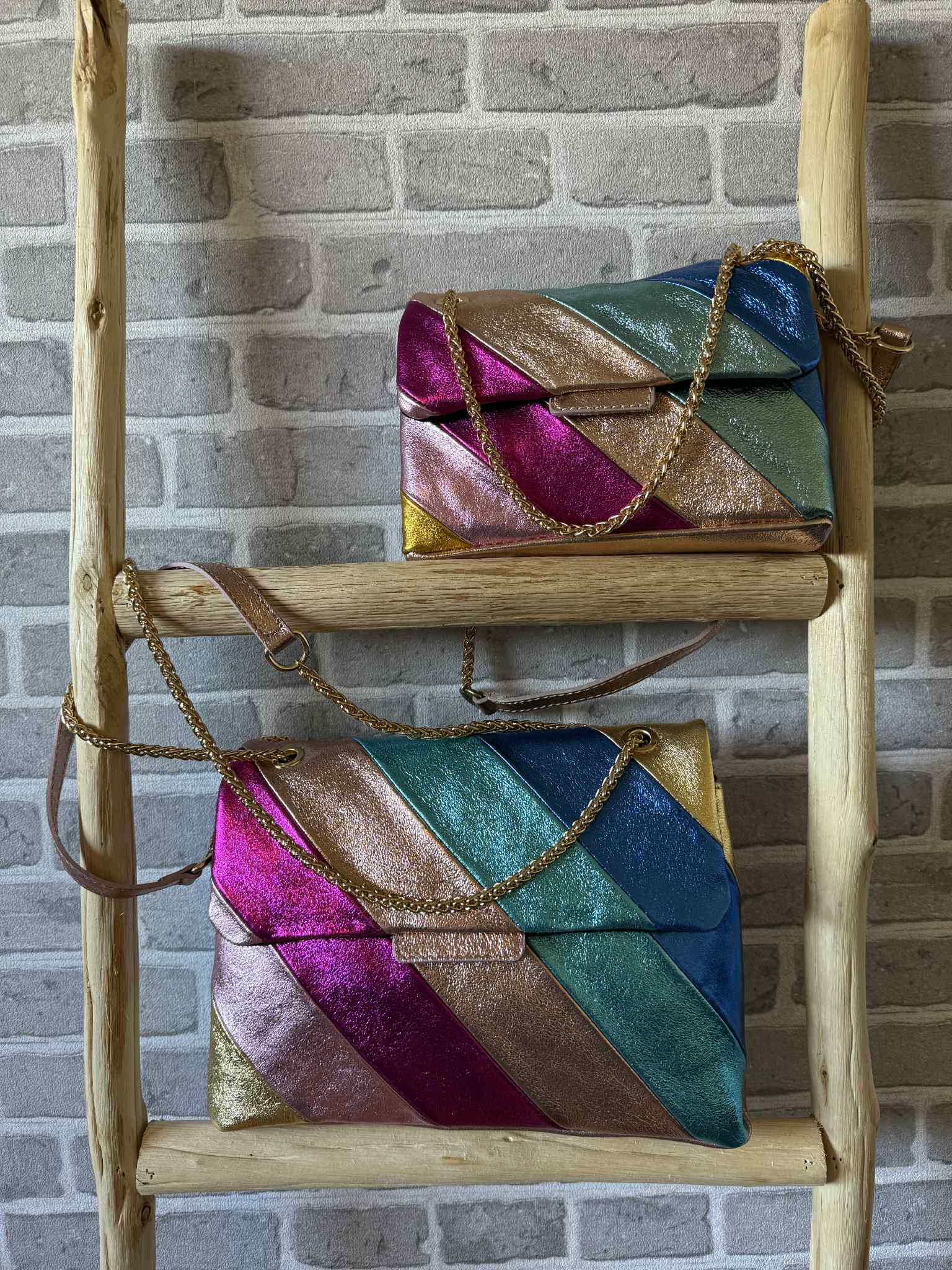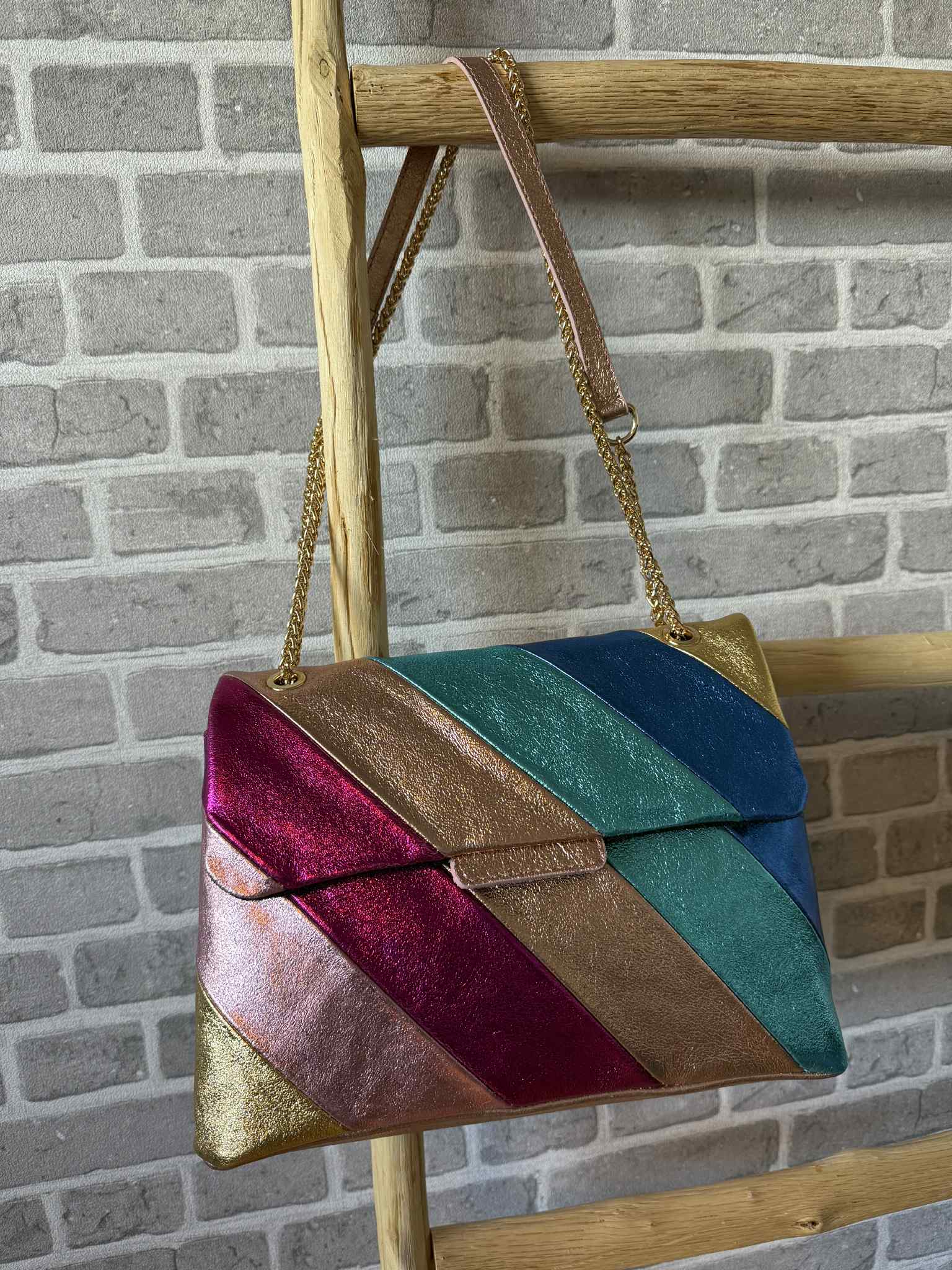 - Un design signature : cuir lumineux + chaîne dorée = combo chic irrésistible